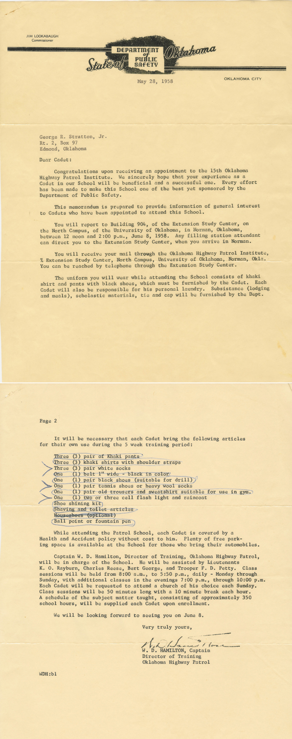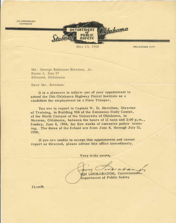 After being discharged, he returned to Oklahoma, to his Wife, and to the Oklahoma Highway Patrol. There he applied again to become a Trooper, now meeting the age and other requirements. He was accepted to the 15th Oklahoma Highway Patrol Academy, held in Norman, Oklahoma.