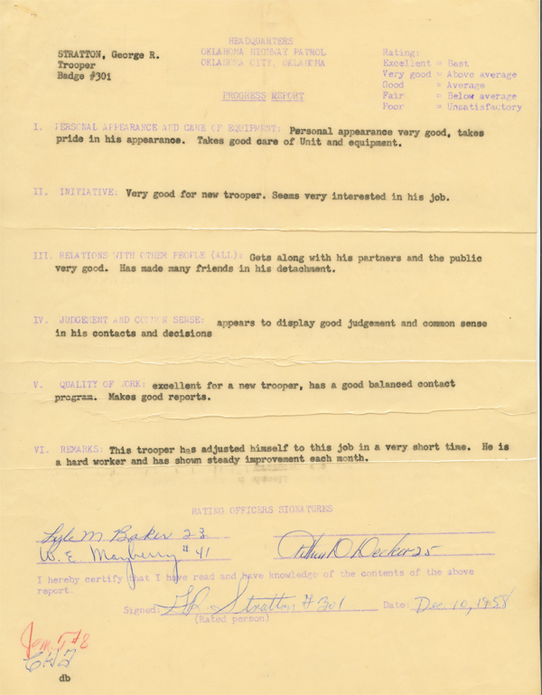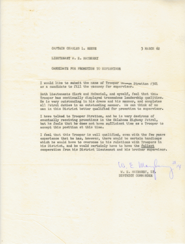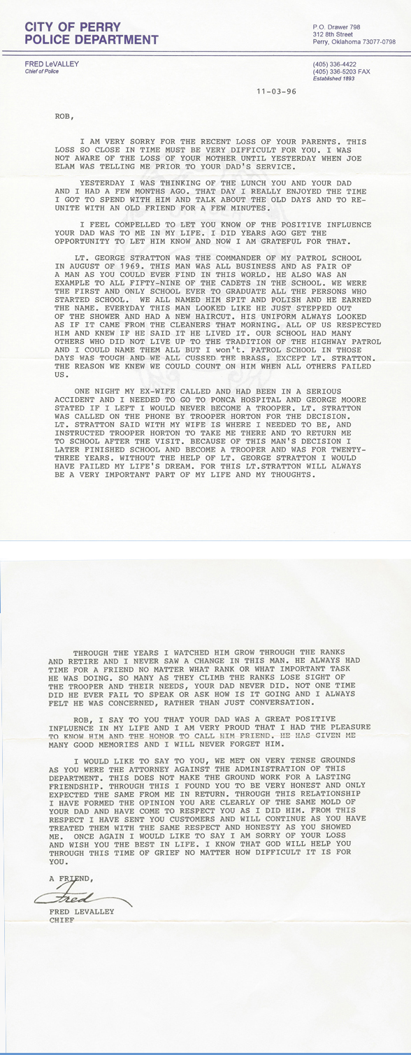 One night when I was a teenager, my mother was returning to Edmond on Highway 412 from Enid on gravel, under construction. She had taken me and a couple of baseball buddies to swim in Enid with family. I can remember the conversation between her and the Trooper that had stopped her for speeding. He recognized her name and asked, "Are you Major Stratton's wife?" She said, "Yes, so I guess I should know better." He said, "I don't know what he would do if he found out I stopped you for speeding and didn't write you a ticket." The next night at the dinner table I asked my dad why he couldn't just take care of the ticket. He looked up and said, "Son, how do you expect me to enforce the law with the public, if I can't expect my own family to follow it?"