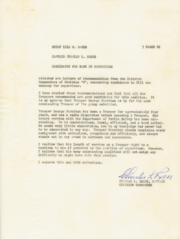 When Commissioner Roger Webb appointed him Assistant Commissioner, he recognized the attributes necessary for leadership, including both of their commitments to the Lord. That commitment gave my father an insight into law enforcement, law enforcement officers, and the community. The most difficult aspect of accepting the appointment was that he would have to resign being a trooper to fill the post.